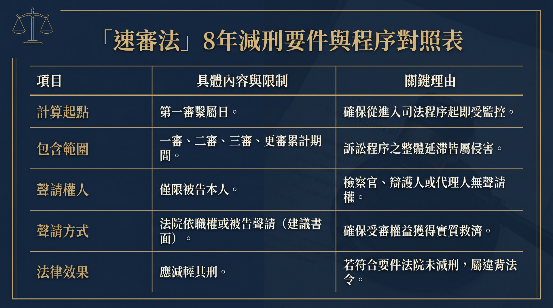 刑事妥速審判法第7條規定:「自第一審繫屬日起已逾八年未能判決確定之案件,除依法應諭知無罪判決者外,法院依職權或被告之聲請,審酌下列事項,認侵害被告受迅速審判之權利,且情節重大,有予適當救濟之必要者,應減輕其刑: 一、訴訟程序之延滯,是否係因被告之事由。 二、案件在法律及事實上之複雜程度與訴訟程序延滯之衡平關係。 三、其他與迅速審判有關之事項。」