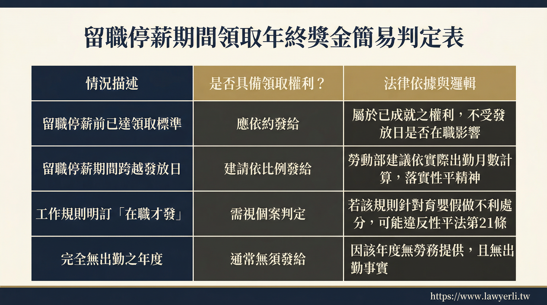 如果受僱者在進入留職停薪前,就已經符合公司規定的獎金領取要件(例如:發放基準是看前一年度的績效),即使發放獎金的那天受僱者正在休育嬰假,雇主仍應依約發給,不能以「發放當日不在職」為由扣發。